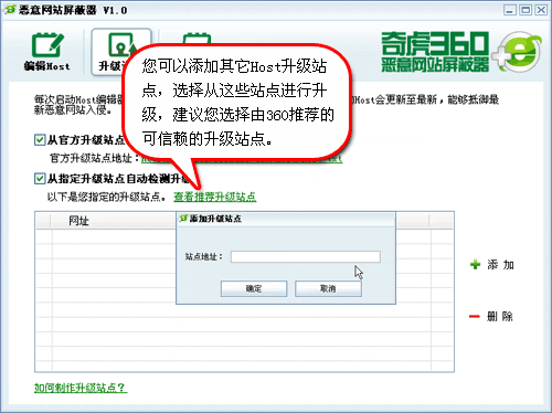 从指定升级站点自动检测升级:您可以自己指定Host表升级站点,每次开启360恶意网站屏蔽器时将自动检测您指定的升级站点是否有更新,若有更新将提示您更新至本机Host