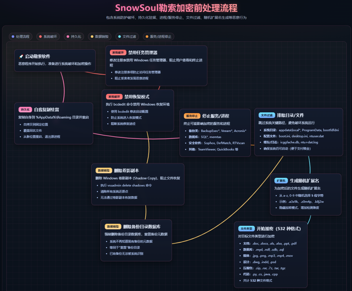SnowSoul勒索软件加密前置处理流程图如下: