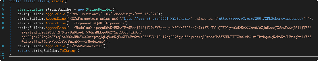 这一加密操作使用的RSA公钥,通过硬编码方式直接内置在程序代码中: