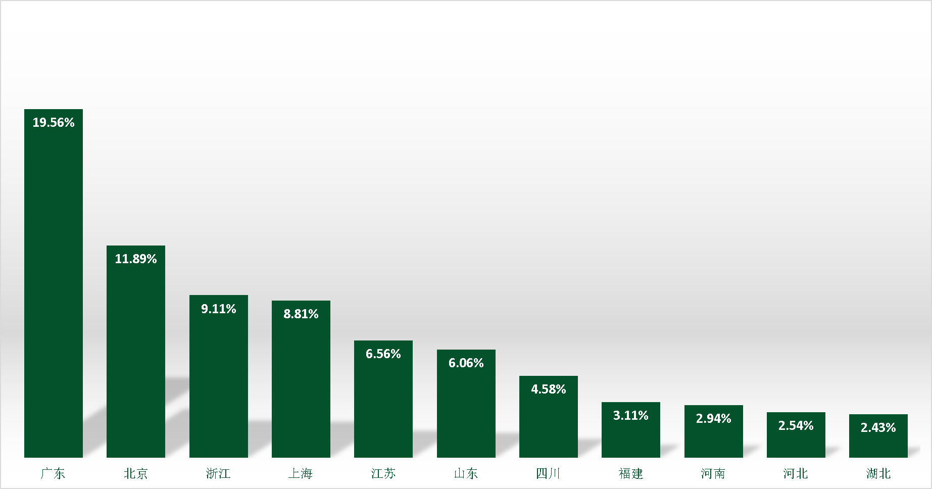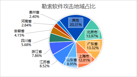 本轮勒索软件攻击发生的地域分布,发现北京、广东、上海位列前三,总体分布情况如下图: