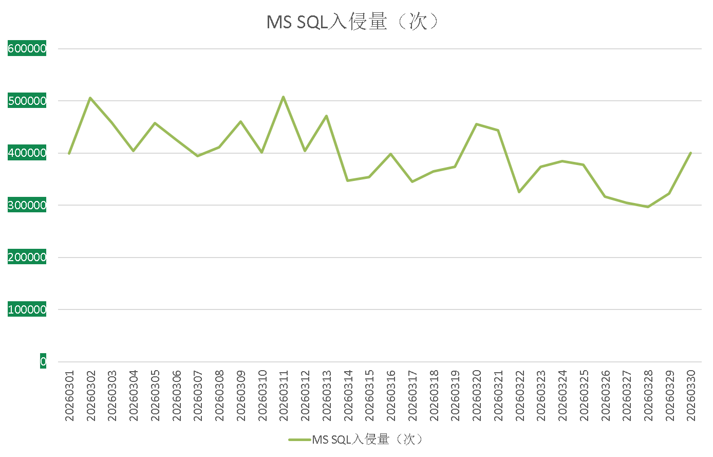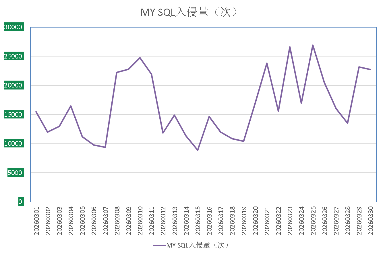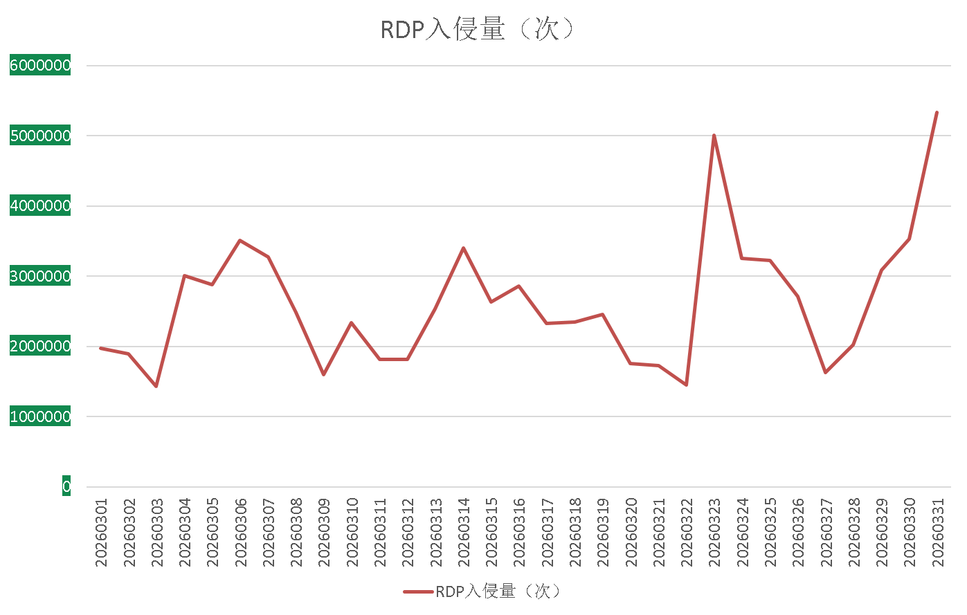 通过观察2026年3月弱口令攻击态势发现,RDP弱口令攻击、MYSQL弱口令攻击和MSSQL弱口令攻击整体无较大波动。