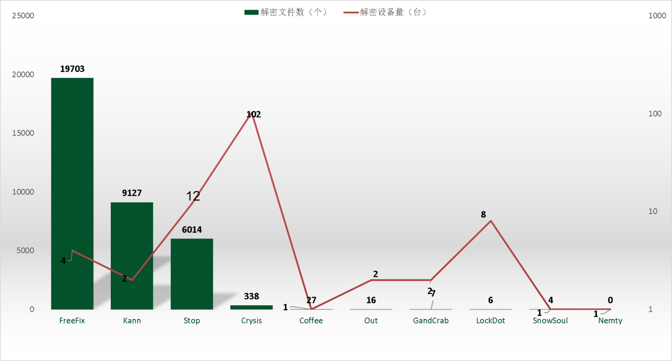 从解密大师本月解密数据看,解密量最大的是FreeFix,其次是Kann。使用解密大师解密文件的用户数量最高的是被Crysis家族加密的设备。