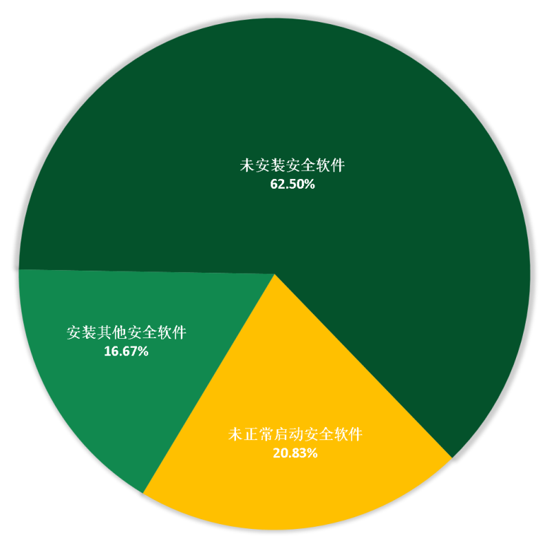 本月的勒索反馈中未安装安全软件的占比达到62.50%,而未正常启用360安全软件的设备数量则占比20.83%,安装了其他安全软件的设备则占比16.67%。在溯源分析中发现,所有安装了360安全软件的反馈设备均未开启相关防护,尚未发现绕过360多维防御体系的勒索攻击。