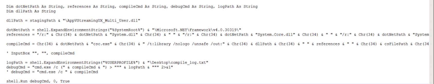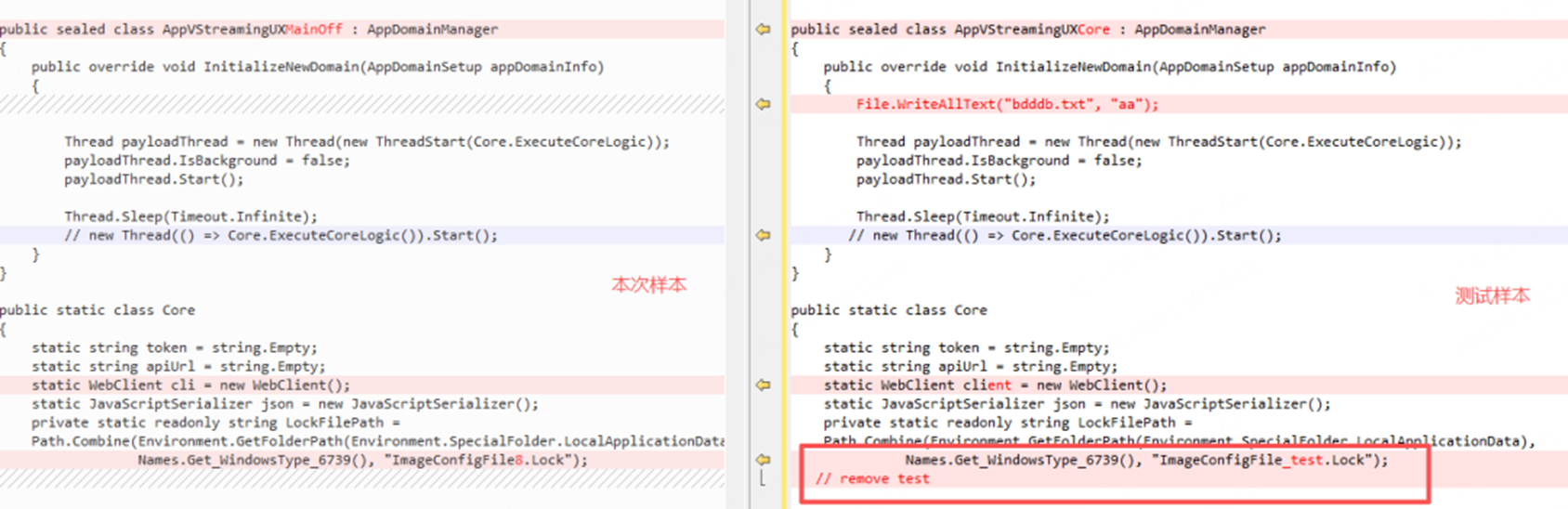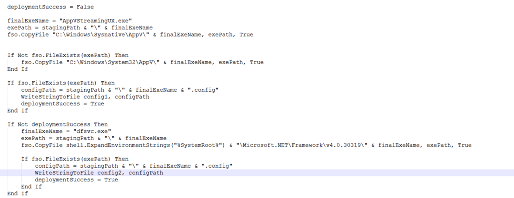 接着优先将AppVStreamingUX.exe文件拷贝到“%LOCALAPPDATA%\WindowsMediaSync”,如果拷贝失败,则将“dfsvc.exe”文件拷贝到%LOCALAPPDATA%\WindowsMediaSync目录下。并将AppVStreamingUX.exe.config,dfsvc.exe.config同步释放到%LOCALAPPDATA%\WindowsMediaSync目录下,并使用csc.exe编译生成“AppVStreamingUX_Multi_User.dll”。