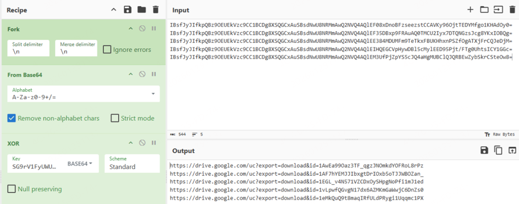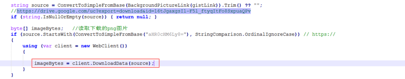 然后使用内存加载的方式执行各个模块,从上述得到的谷歌云盘URL获取解密数据,解密方式依然采用base64+xor的方式如下所示: