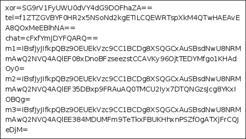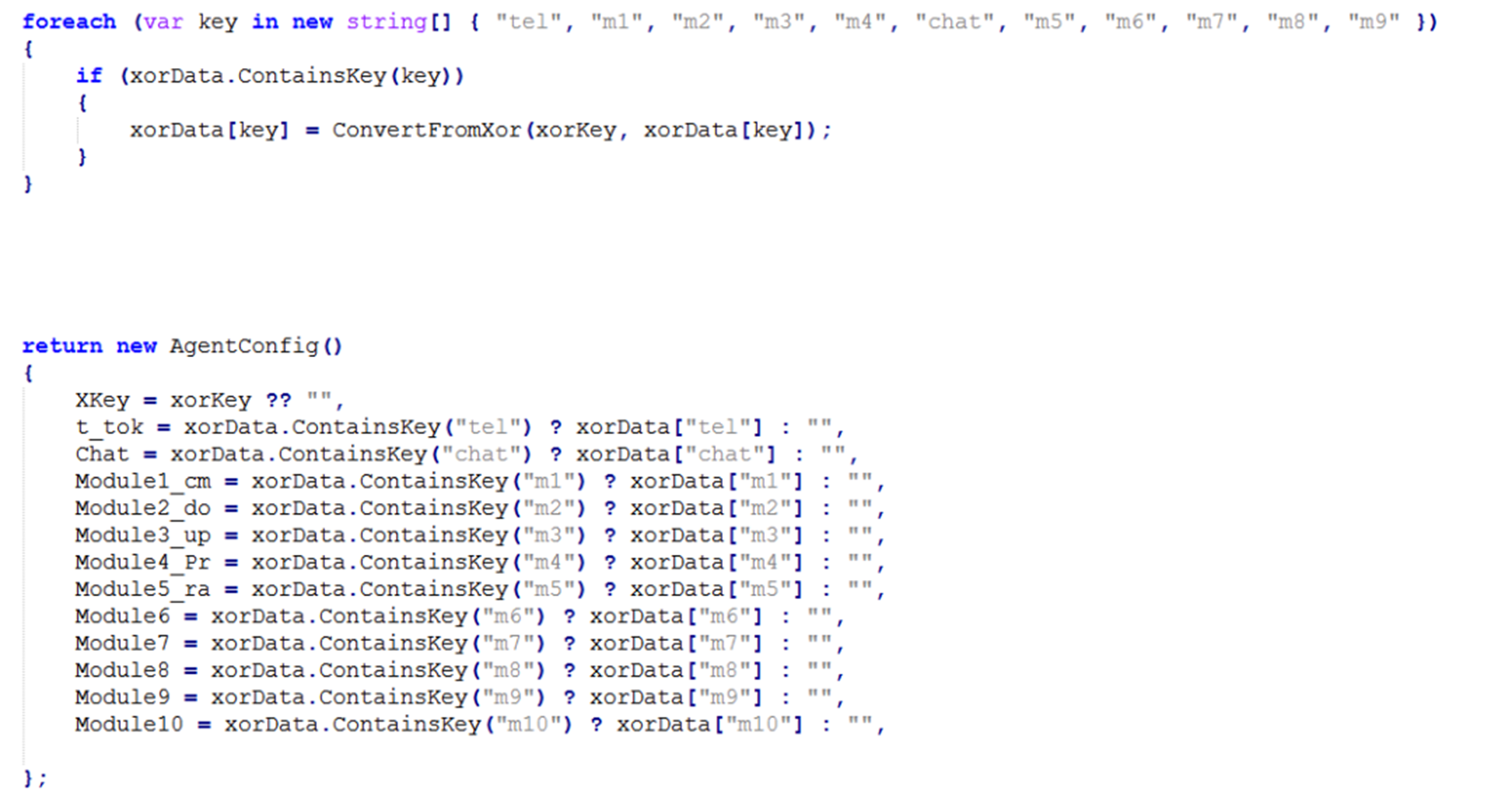 第四步:根据XORKey,依次使用Base64+XOR解密获取配置信息,并将配置信息进行填充,xor表示异或解密使用的Key,tel表示token,chat为chatId,m1-m5分别是下一阶段模块的下载地址,其余字段未使用。