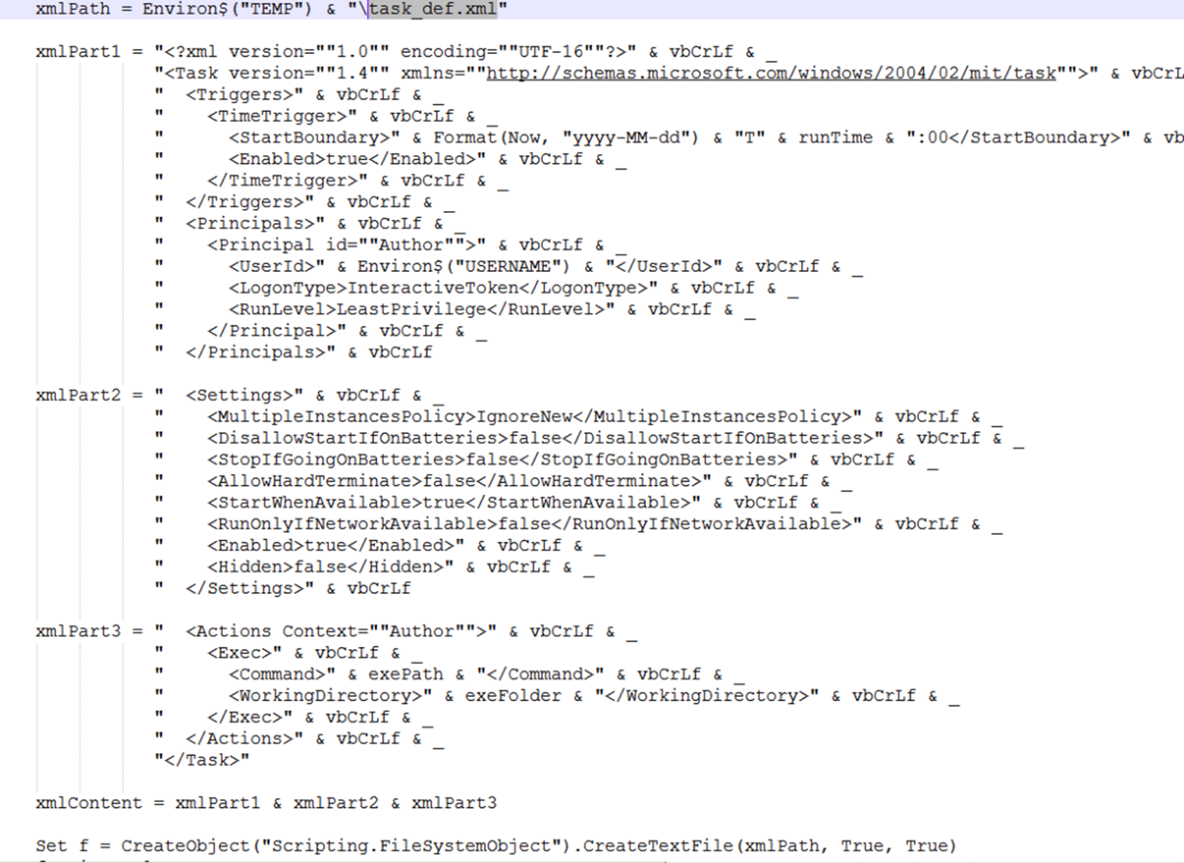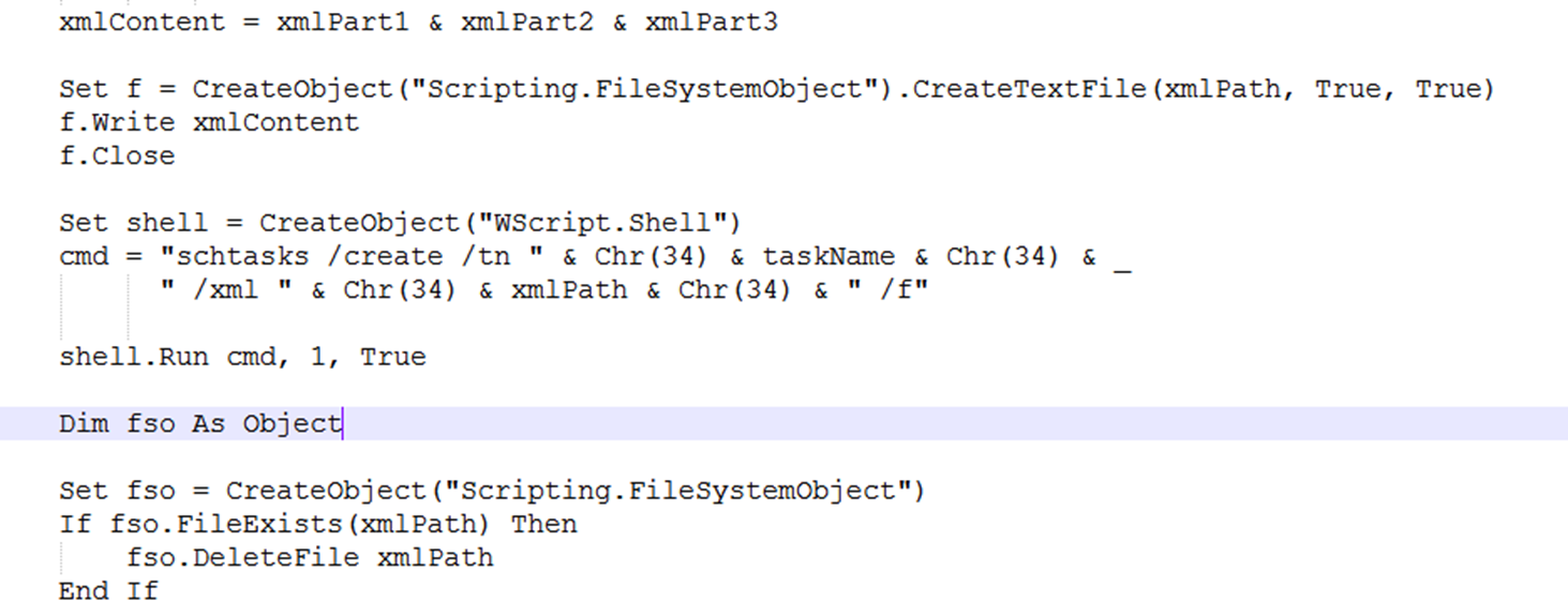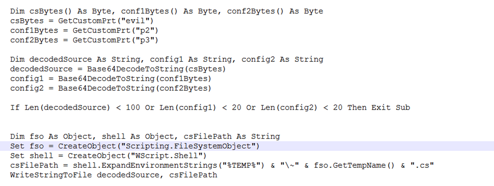 一旦受害者打开该恶意文档,当启用宏之后,宏代码会依次获取名为“evil”,“p2”,“p3”的customXml对象。然后再将其Base64解码,依次得到C#源码,AppVStreamingUX.exe.config和fsvc.exe.config,并将C#源码释放到临时目录下。