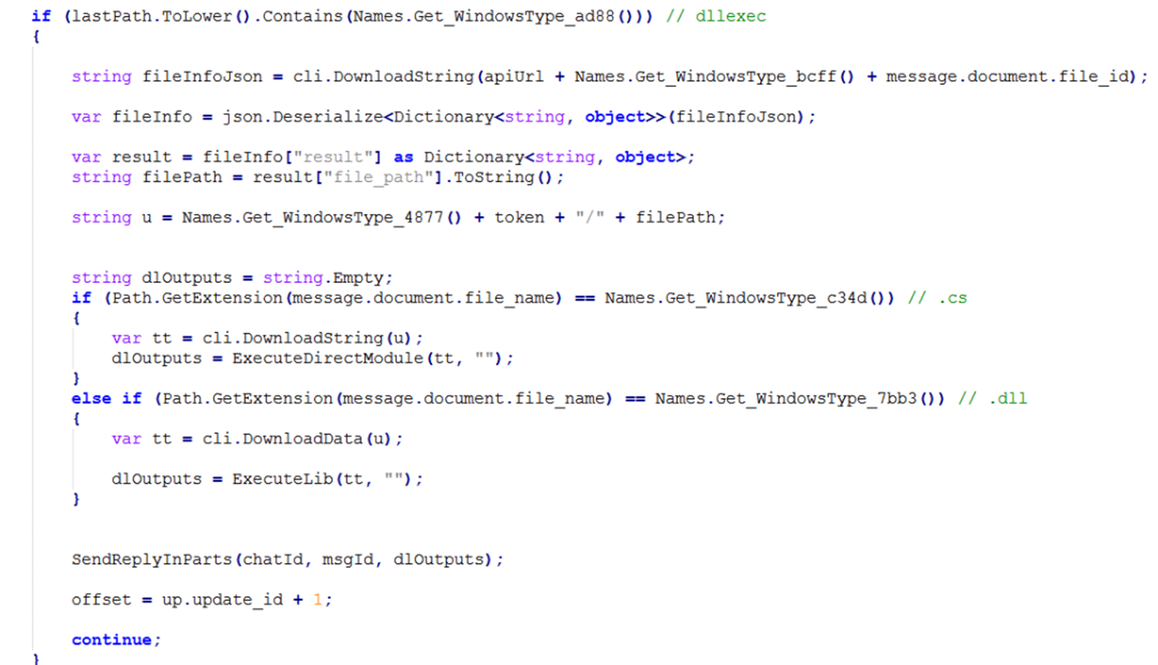 然后通过Telegram Bot API实现C2通讯交互从而实现远程控制,目前支持的功能有dllexec,upload,download,cmd,runapp。