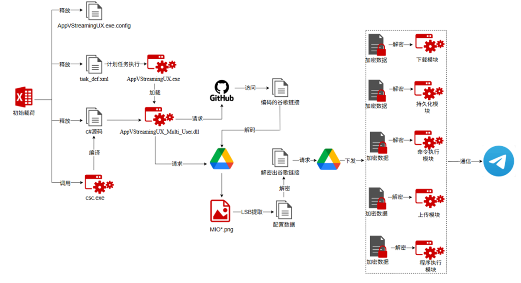 OilRig组织近期以伊朗全国性抗议事件为相关主题的钓鱼攻击中,投放了高度隐蔽的Excel宏文档,这些样本利用社会热点事件(如“德黑兰xx名单、最终名单_德黑兰xx.xlsm”等)伪装诱饵,诱导目标启用宏后触发多阶段感染链:首先通过VBA宏从CustomXMLParts解码出C#源代码,现场调用csc.exe编译成恶意加载器;该加载器启动后访问硬编码的GitHub仓库,从中读取经编码的配置数据,解析得到Google Drive共享链接;链接指向一张看似普通的图片,但内部采用LSB(最低有效位)隐写技术嵌入加密配置;加载器提取并解密配置后,获取多个后续模块的下载地址,逐一下载并动态加载窃密、命令执行等功能模块,最终通过Telegram Bot API建立加密C2通道,实现命令控制、数据窃取与回传。流程如下所示: