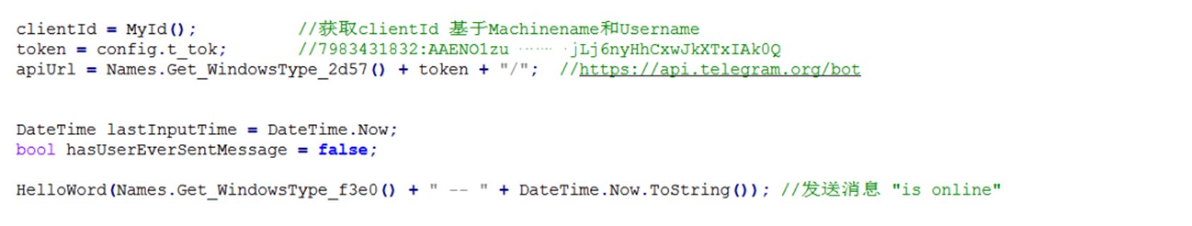 然后通过telegram API发送"is online"消息,实现心跳上线。