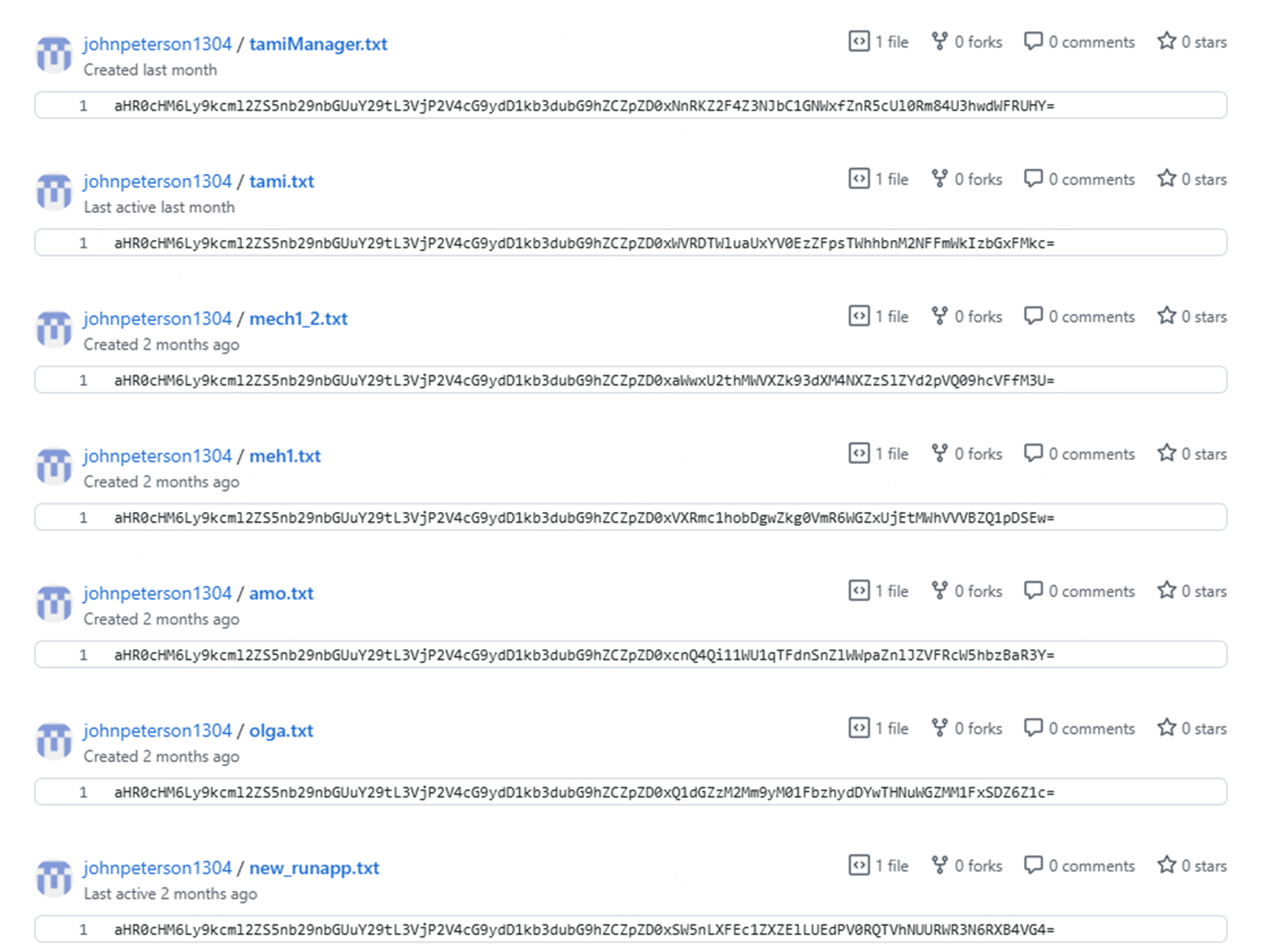 值得一提的是我们发现该github用户johnpeterson1304的名下,还存在多个命名规则相似、仅包含单一txt文件的独立仓库,其文件内容均为 Base64编码字符串,用于外部资源(Google Drive)下载链接的托管与分发,这些链接都是指向图片,对这些图片使用LSB算法提取配置信息并解密后得到的信息相同,后续和上述分析一致。