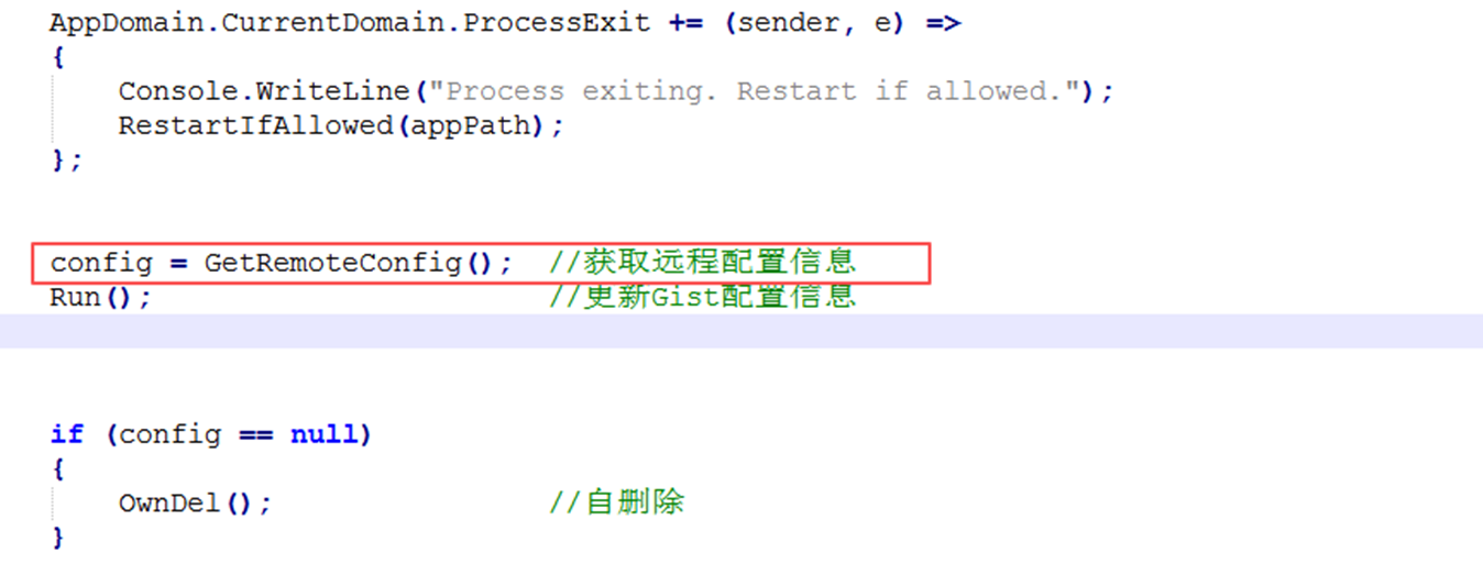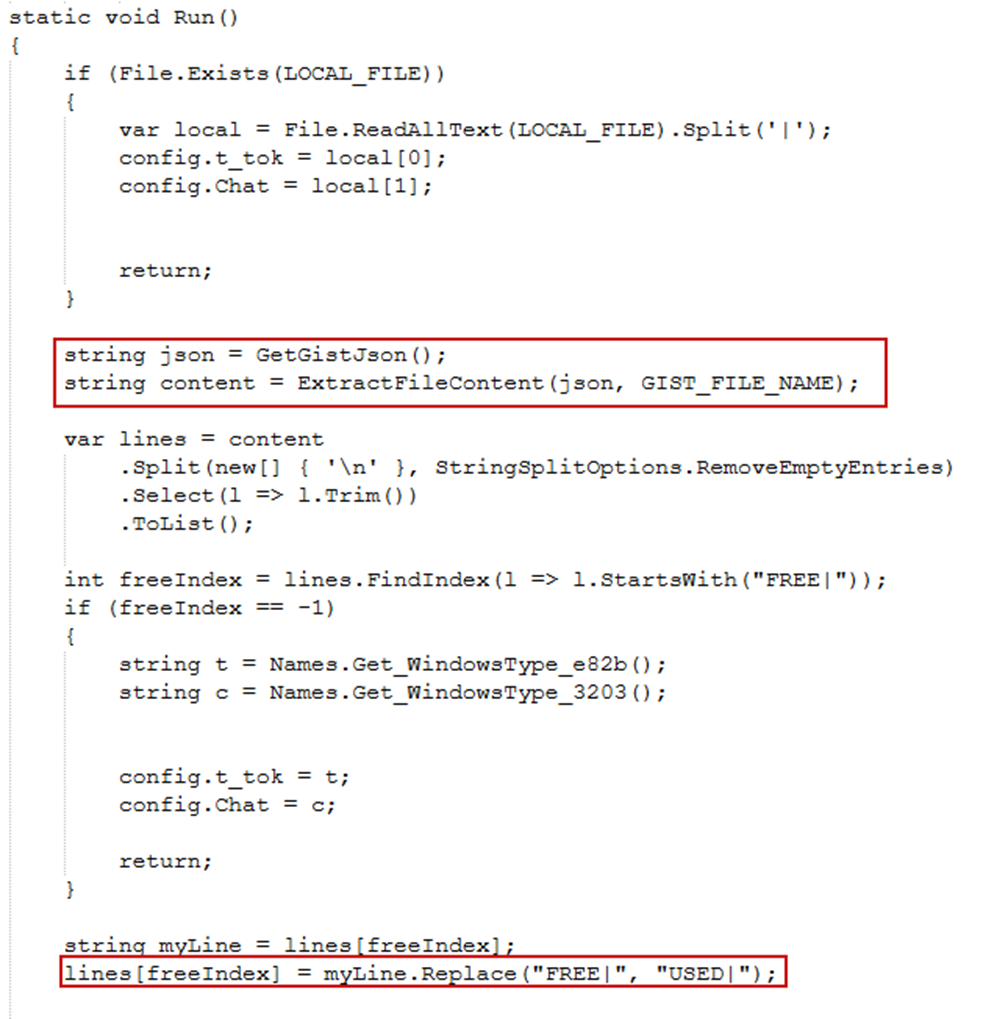 接着通过GitHub API获取指定Gist中的配置文件(etagtest.txt),然后解析内容并抢占标记为"FREE"的配置项(将其状态更新为"USED"),最后将包含Telegram Bot Token和Chat ID的配置信息写入本地缓存(CONF.dat)以便后期使用,并同步更新Gist的配置文件etagtest.txt中。
