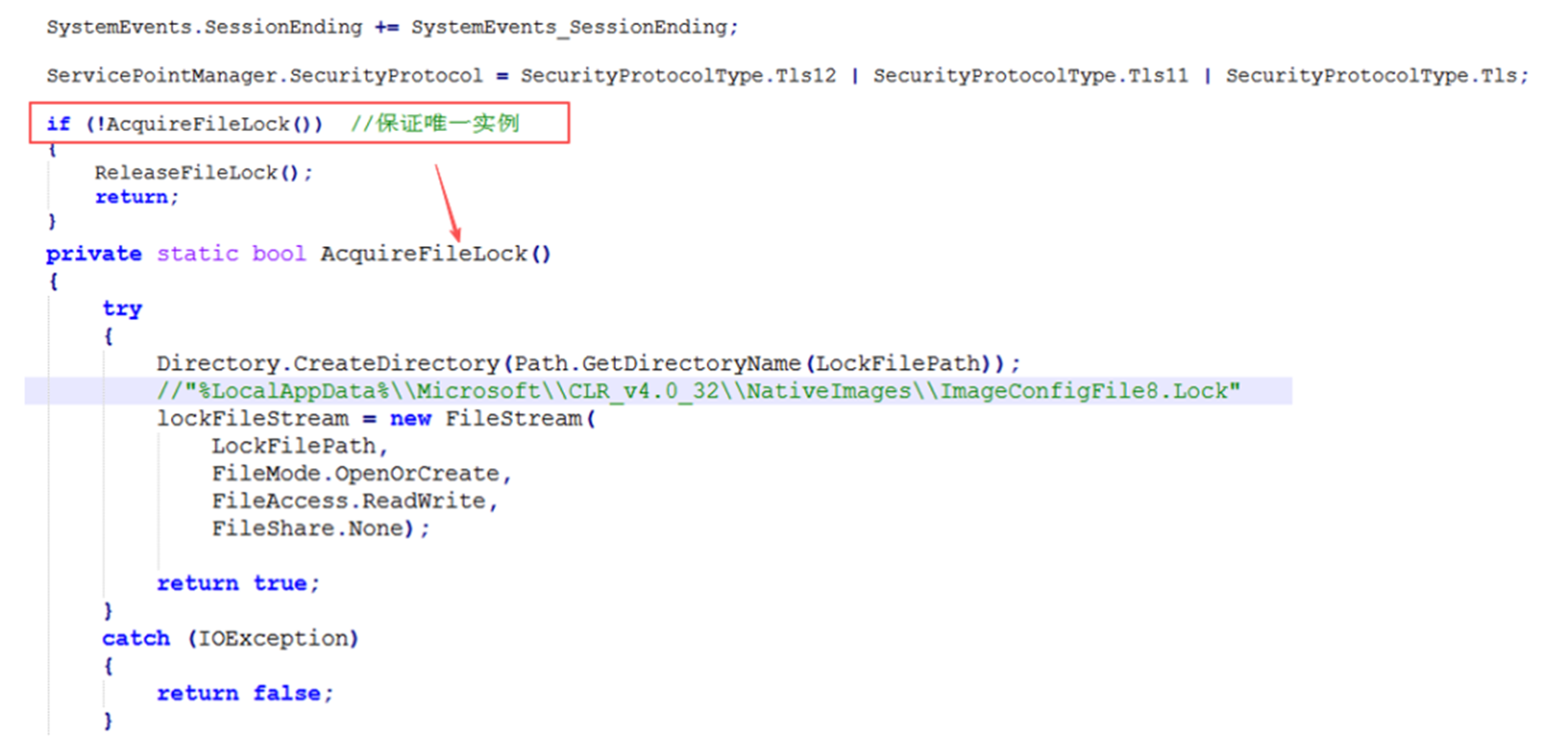 首先,会打开“%LocalAppData%\\Microsoft\\CLR_v4.0_32\\NativeImages\\ImageConfigFile8.Lock”文件,以保证单一实例。