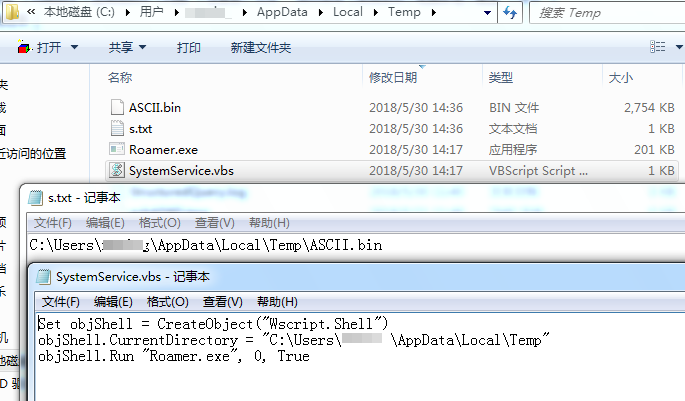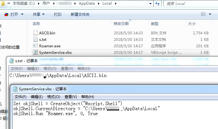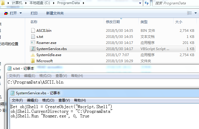 木马把VBS和木马本身添加多个计划任务启动项,其中下图ASCII.bin和SystemIdel.exe文件其实相同,只是名字不同,Roamer.exe的作用是从s.txt中读取文件路径,然后启动它,也就是给木马创造多个启动机会,防止木马本身被杀。