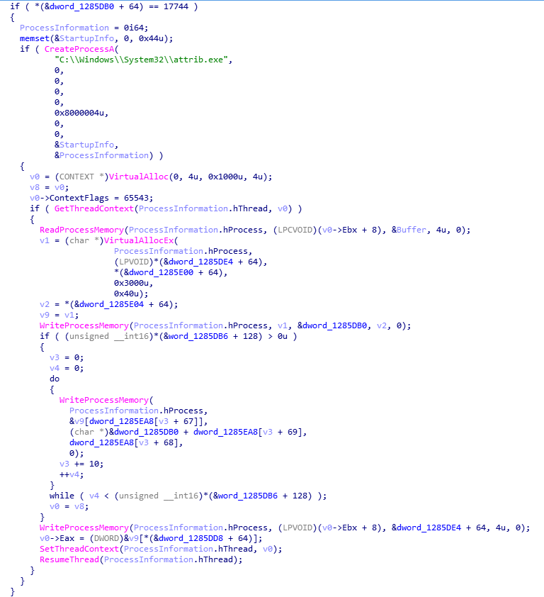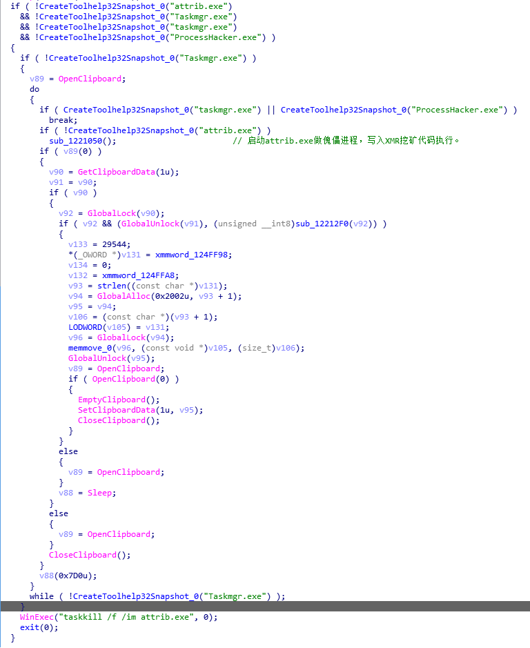 木马运行挖矿前会枚举检测进程中是否有attrib.exe、Taskmgr.exe、taskmgr.exe、ProcessHacker.exe,有则退出,没有则创建attrib.exe进程注入XMR开源的挖矿程序进行挖矿。