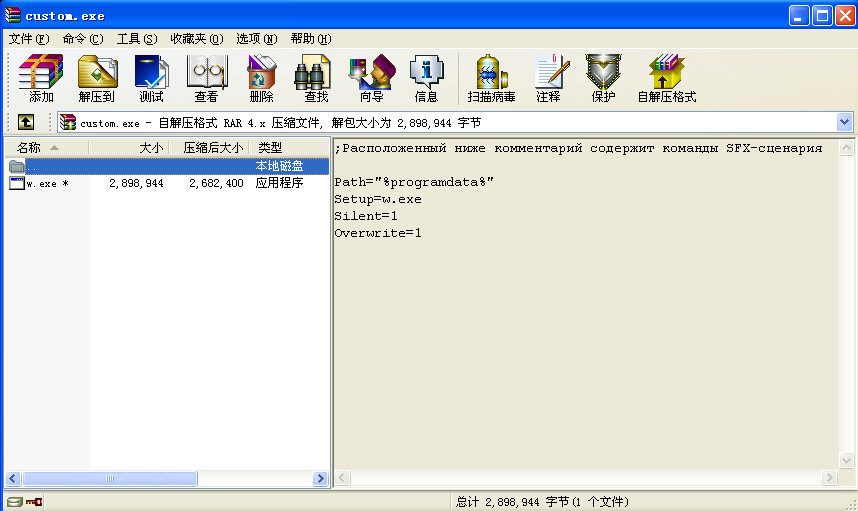 批处理会把带密码为w的自解压文件进行运行,木马运行释放到C:\ProgramData\SystemIdle.exe再启动。