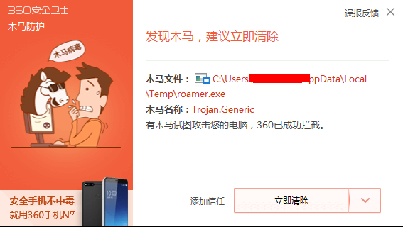 近期挖矿木马非常活跃,让人防不胜防。建议用户及时打上系统补丁,一旦发现电脑卡慢等异常情况请立即使用安全软件扫描。同时也请注意保证安全软件的常开以进行防御,一旦受诱导而不慎中招,尽快使用360安全卫士查杀清除木马。