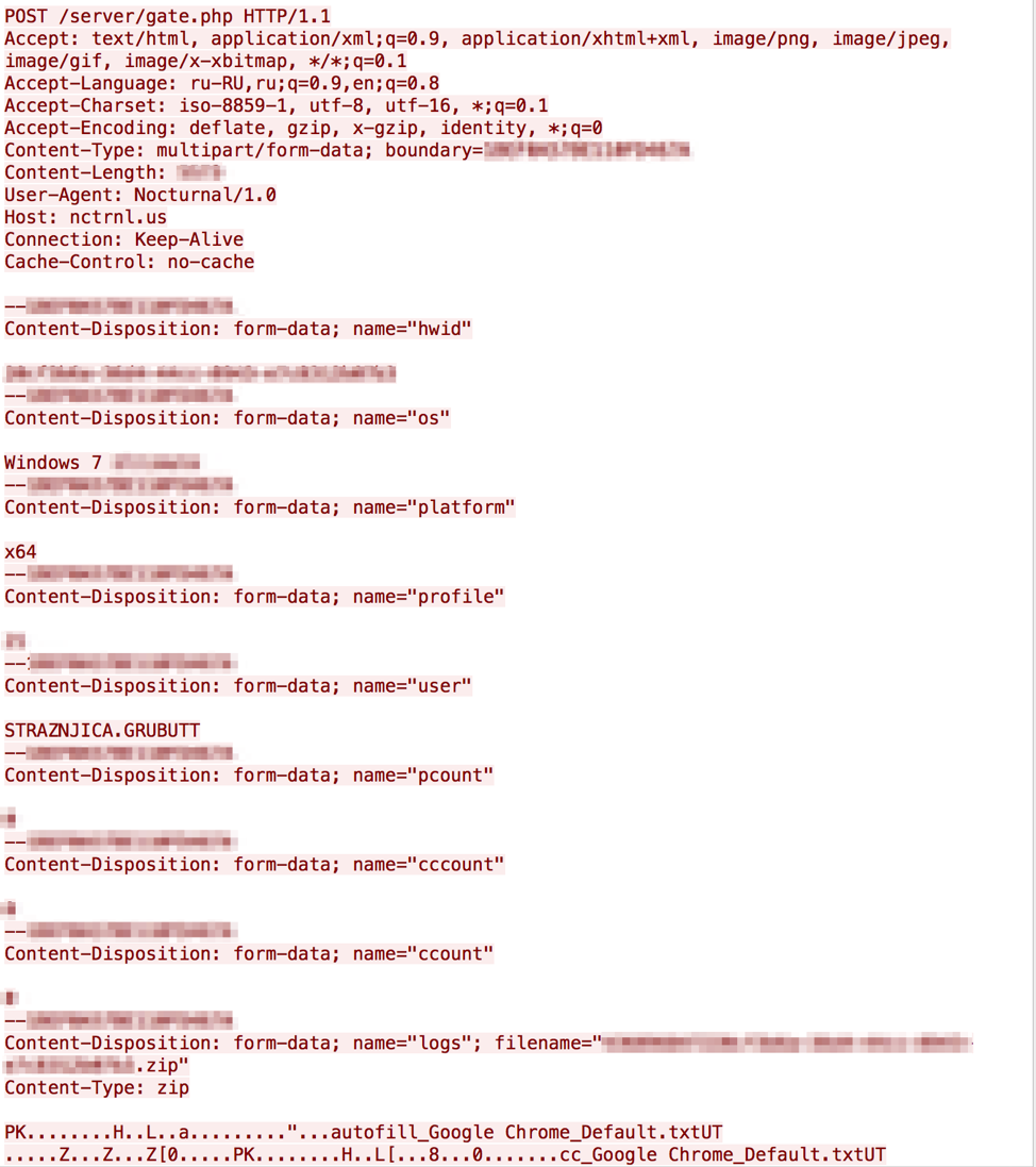 Nocturnal Stealer利用包含被盗信息的多个HTTP POST表单来发送给C&C。此报告包含跟踪感染和管理受感染客户端的相关信息,例如:HWID、操作系统、系统体系结构和用户名。重要的是,这份报告还包含收集数据的zip存档。第一个文本文件passwords.txt(即使为空)也包含从受感染机器的各种浏览器或钱包中恢复的密码。’information.txt’文件包含关于受感染机器的一般信息的详细报告,类似于HTTP POST其他部分中观测到的情况,但它还包含了一些额外的信息,例如在受感染的机器上运行进程。