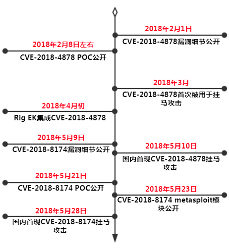 图8 CVE-2108-4878和CVE-2018-8174从公开到国内首现挂马利用时间线