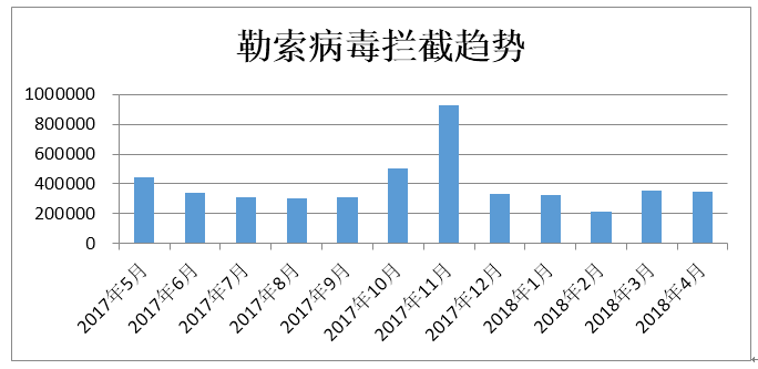 WannaCry之后,勒索病毒全面进入人们的视野。数据统计显示:2017年全年勒索病毒传播量超过500万,而2018年截止到4月底,勒索病毒的传播量就已达到124万。而从WannaCry爆发的2017年5月至2018年4月底,一年的时间内,勒索病毒传播量也接近500万。