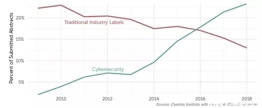RSA的关键词是一个很好的视角,来观察网络安全行业的热点变化,今年初RSA与Cyentia Institute联合对过去10年RSA的热词和标签进行了研究,以此揭示过去10年的行业发展。
