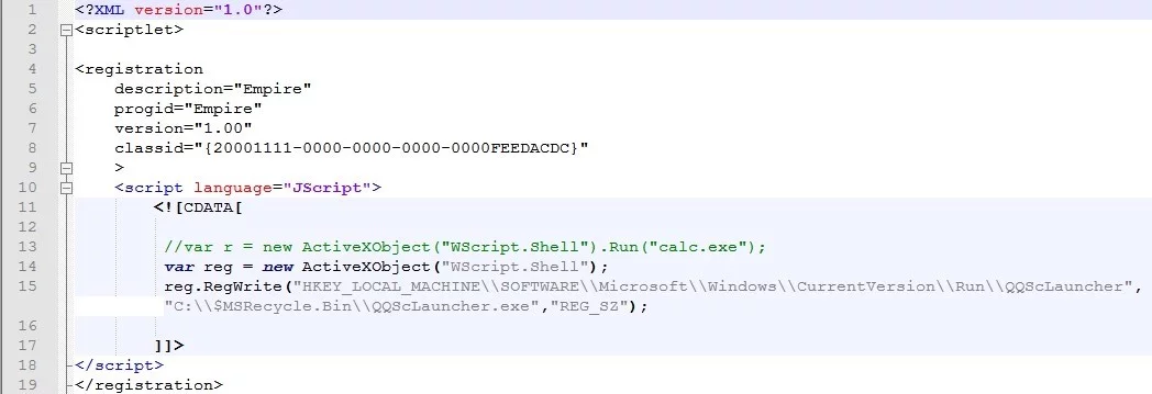 本样本通过regsvr32执行本地sct文件,主要内容如下