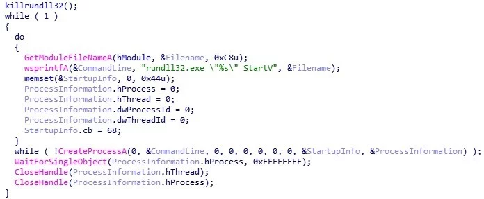同时,在run_StartVhookstub函数中,会不断使用rundll32启动自身模块,