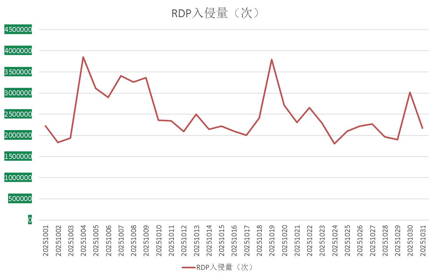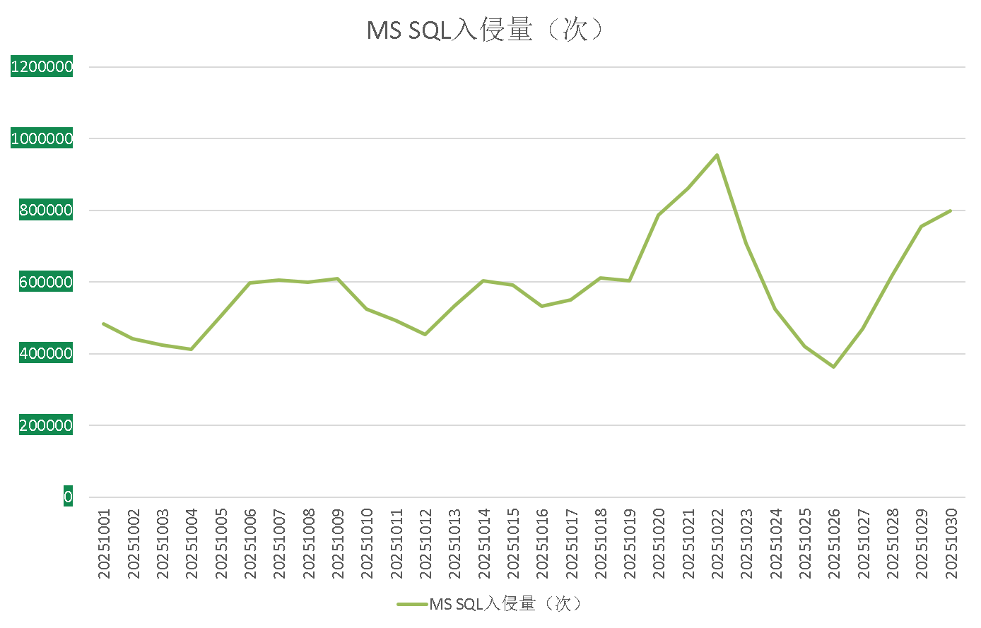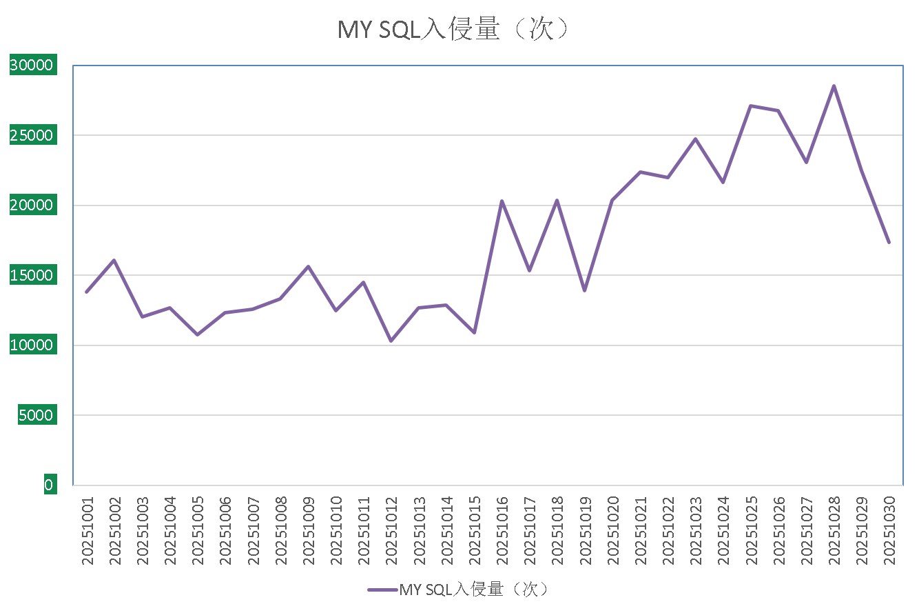 通过观察2025年10月弱口令攻击态势发现,RDP弱口令攻击、MYSQL弱口令攻击和MSSQL弱口令攻击整体无较大波动。