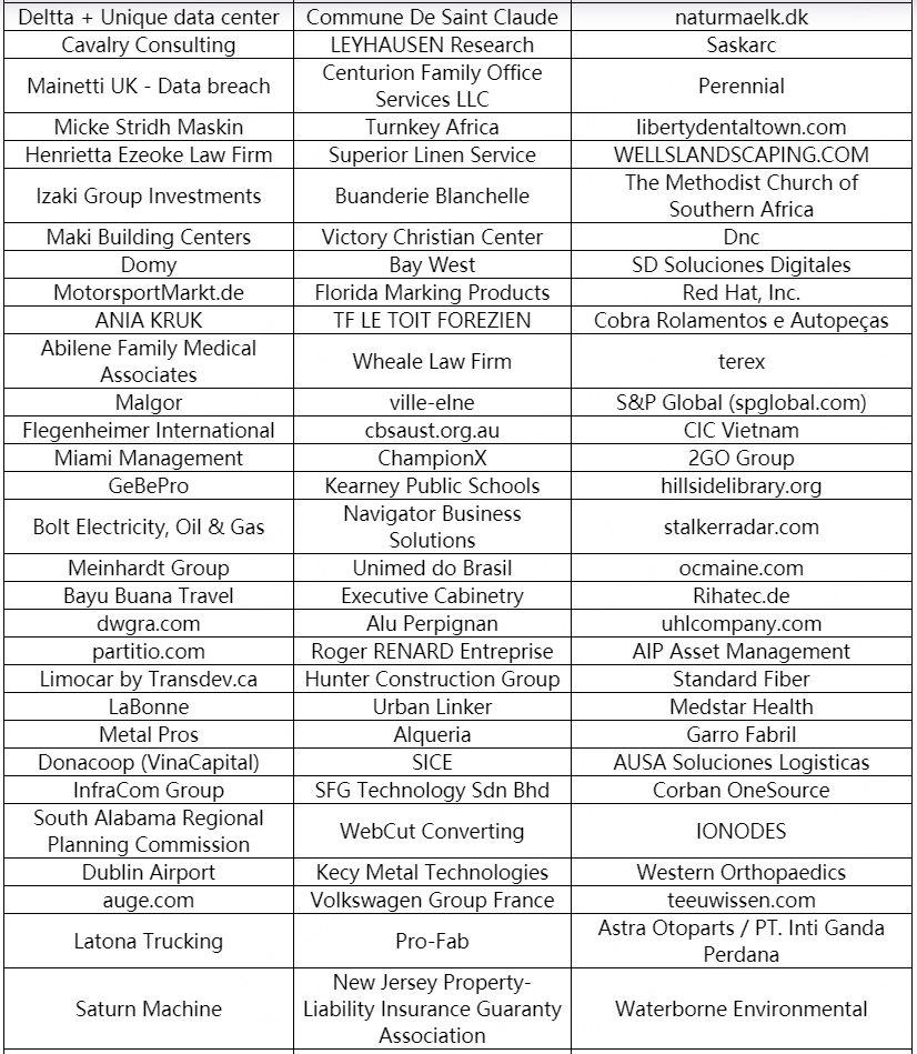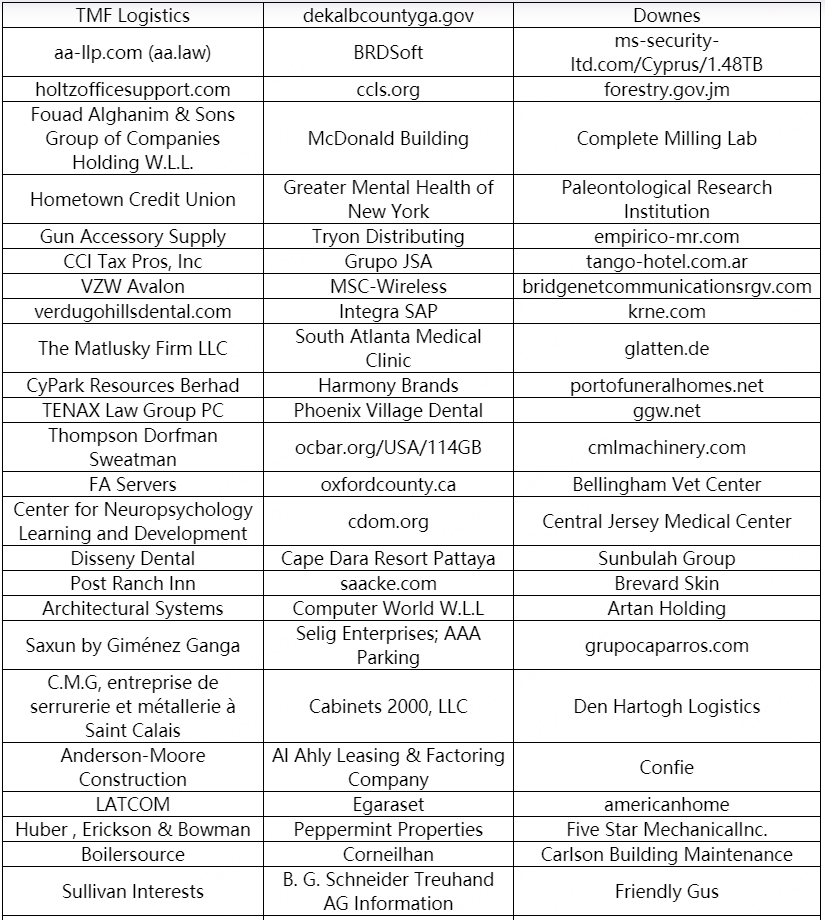 以下是本月被双重勒索软件家族攻击的企业或个人。未发现数据存在泄漏风险的企业或个人也请第一时间自查,做好数据已被泄露准备,采取补救措施。