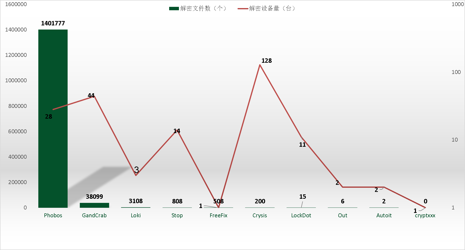 从解密大师本月解密数据看,解密量最大的是Phobos,其次是Crysis。使用解密大师解密文件的用户数量最多的是被Crysis家族加密的设备。
