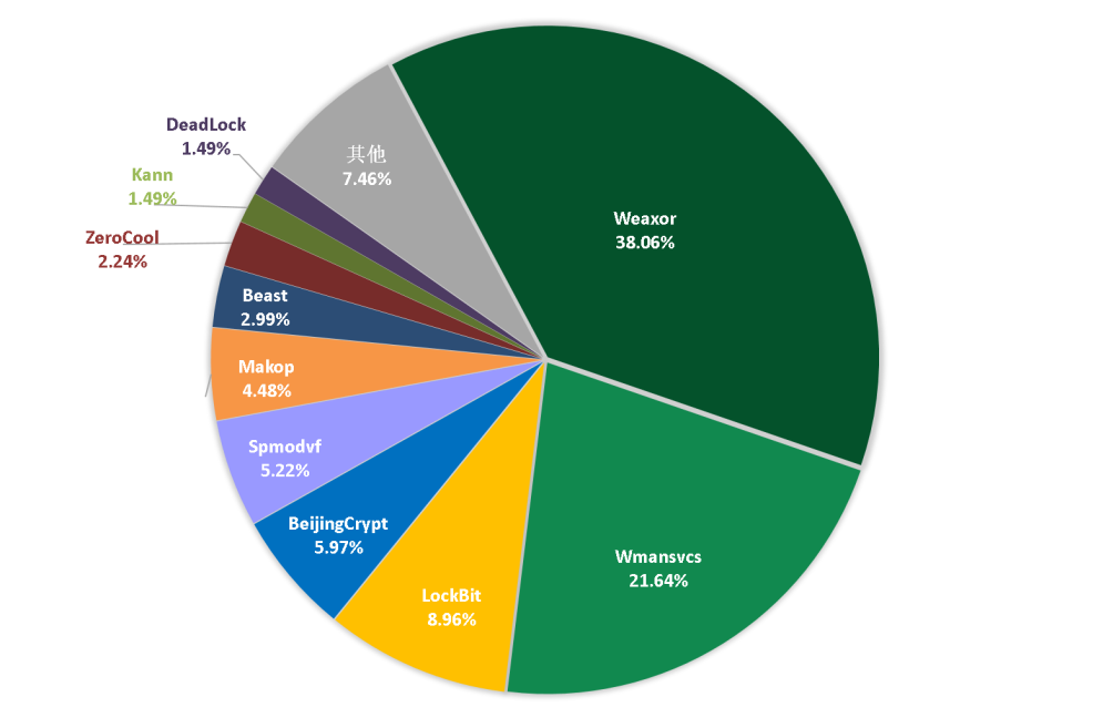 针对本月勒索软件受害者设备所中病毒家族进行统计:Weaxor家族占比38.06%居首位,第二的是Wmansvcs占比21.64%,LockBit家族以8.96%占比位居第三。